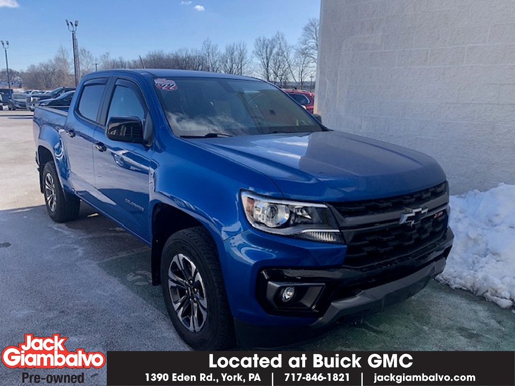 Bright Blue Metallic 2022 Chevrolet Colorado Z71 4WD 8-Speed Automatic V6 ONE OWNER! CLEAN AUTOCHECK USB / AUX INPUTS TO PLAY MUSIC! BLUETOOTH HANDS-FREE! BACK UP CAMERA! HEATED SEATS! PREMIUM WHEELS! LOCAL TRADE! 4WD.Recent Arrival!With a wide array of different used and certified pre-owned vehicles to choose from Jack Giambalvo is the best York used car dealer in the area. For years we have been a favorite Harrisburg Lancaster and Hanover PA GMC & Buick used car source; so stop by or contact us today and experience the Jack Giambalvo Buick GMC difference.Your York GMC and Buick dealership is just minutes from Lancaster Shrewsbury New Freedom and Baltimore!